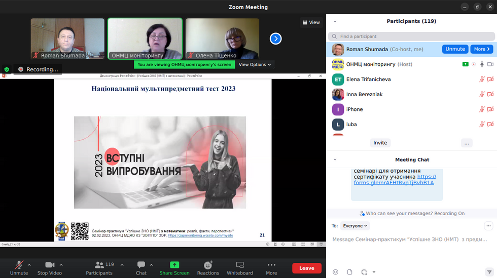 02 лютого 2023 р. в режимі Zoom-конференції обласним науково-методичним центром моніторингових досліджень якості освіти, методичним відділом за участі фахівців Дніпропетровського регіонального центру оцінювання якості освіти, вчителів математики, заступників директорів з навчально-виховної роботи Запорізького ліцею «Логос» Запорізької міської ради, Запорізької гімназії №17 проведено міжструктурний семінар «Успішне ЗНО (НМТ) з математики: реалії, факти, перспективи» для вчителів математики закладів загальної середньої освіти та викладачів математики закладів (професійної) професійно-технічної освіти Запорізької області.